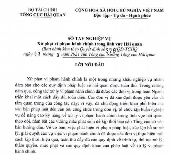 Sổ tay nghiệp vụ xử phạt vi phạm hành chính trong lĩnh vực hải quan do Tổng cục Hải quan ban hành kèm theo Quyết định 376 / QĐ-TCHQ ngày 03/03/2021.